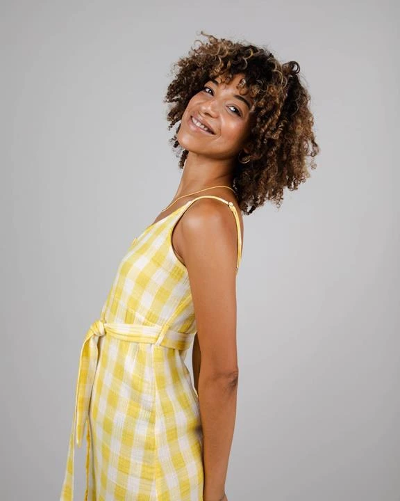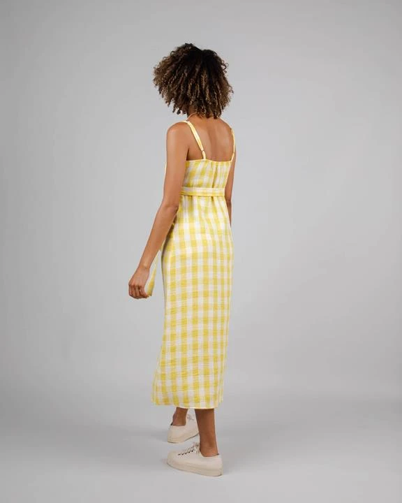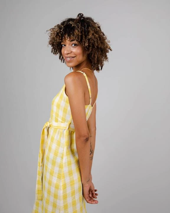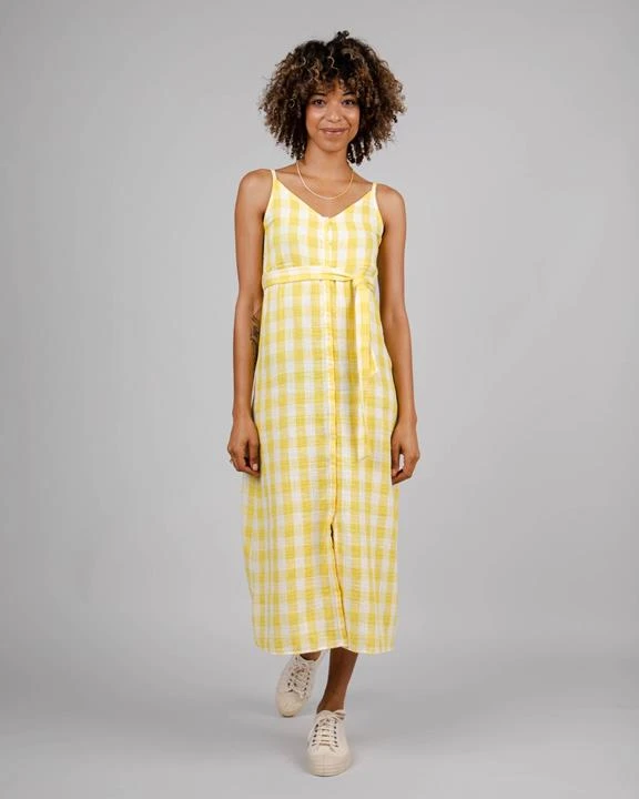 Long strap dress, buttoned, comes with a belt. The soft and light fabric makes it a perfect item for warm summer days. Ethically made of organic cotton and recycled fibers.
