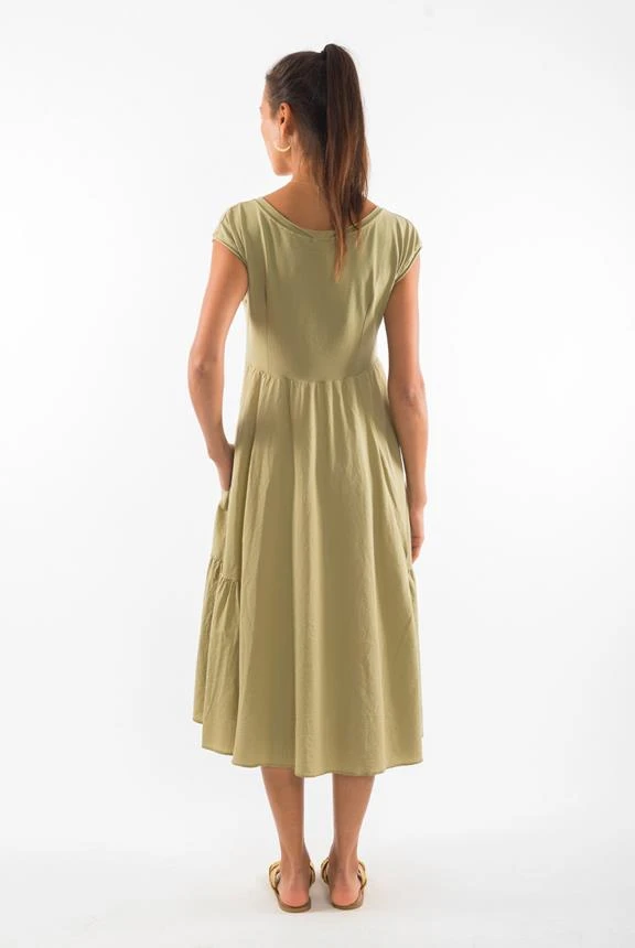 Long round neck dress with short sleeves and pockets.
