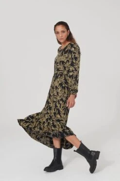 Dress AUDREYANA with extra wide ruffle, high low hem and balloon sleeves made of luxurious leo jacquard is great for festive occasions but in combination with heavy boots also excellent for everyday wear. Favorite piece from our designer Hannah.