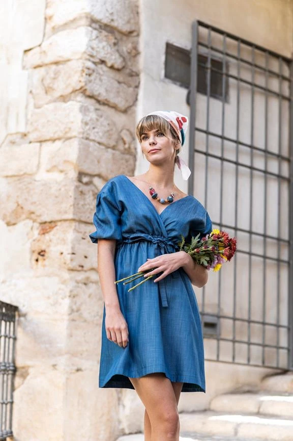 V-neck short dress. Loose skirt and gathered sleeve with elastic waist and tie detail.