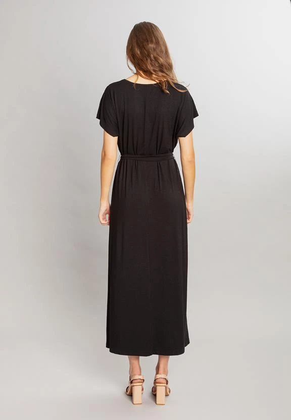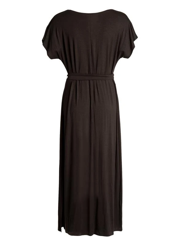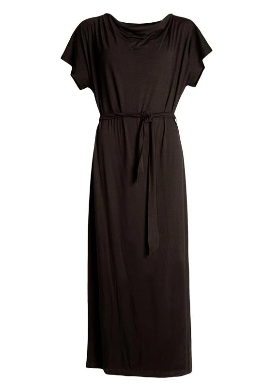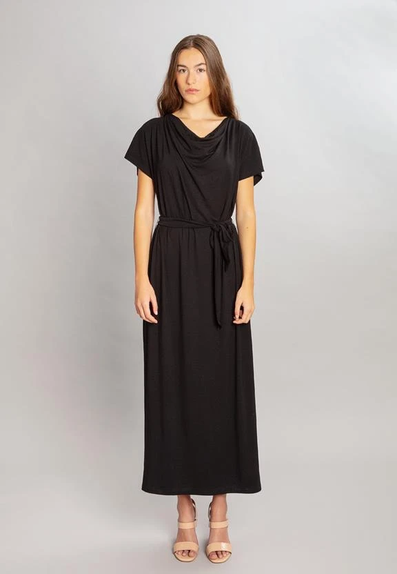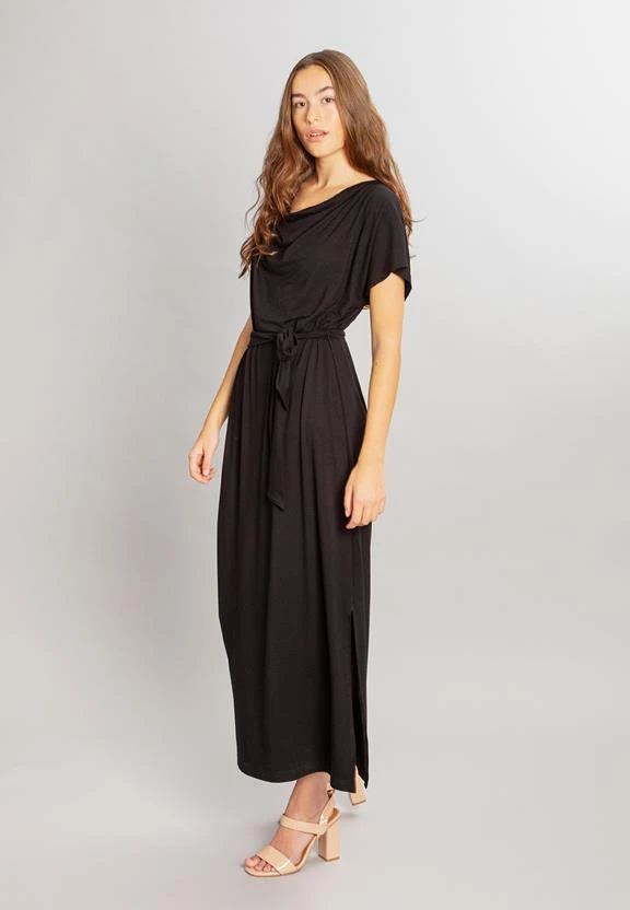 Relaxed dress with beautifully draping neckline. The dress has removable fabric belt, which can be used for adjusting the fit. Slit on the left side seam.