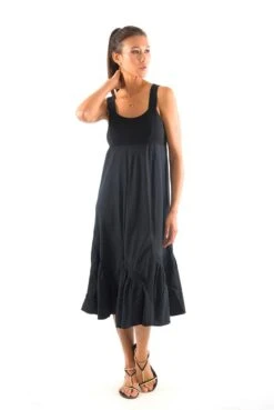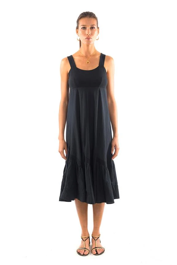 Short sleeveless dress with frills and crossed straps in the back.