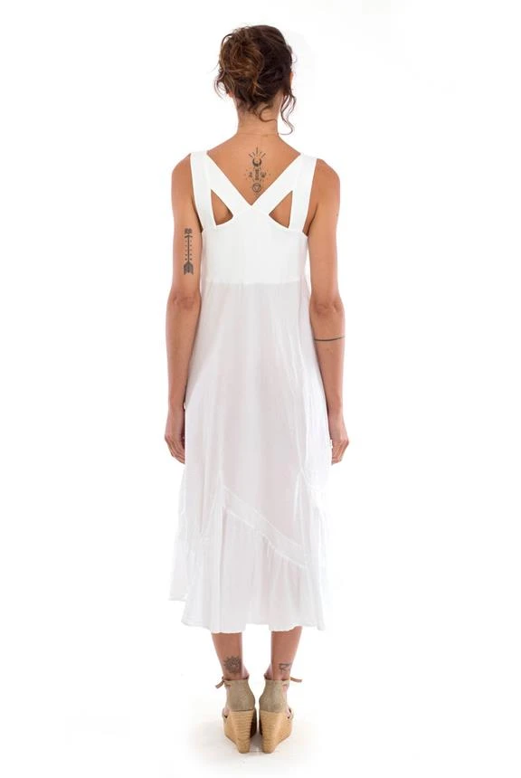 Short sleeveless dress with frills and crossed straps in the back.