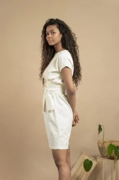 The Eclipse Dress is a multipurpose dress. It comes with a belt so you can wear it with or without it. Either wear it loose as a boxy shaped dress or wrap the belt around the waist for a different look. Featuring a wide boat neckline and short batwing sleeves. Made from a fine organic cotton crepe fabric with an airy feel.