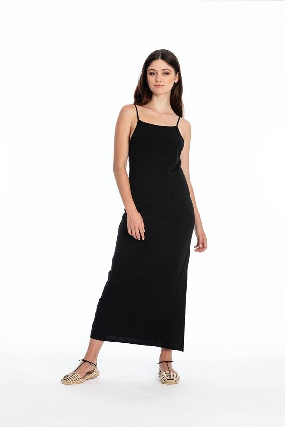 - Sleeveless dress with square neckline.