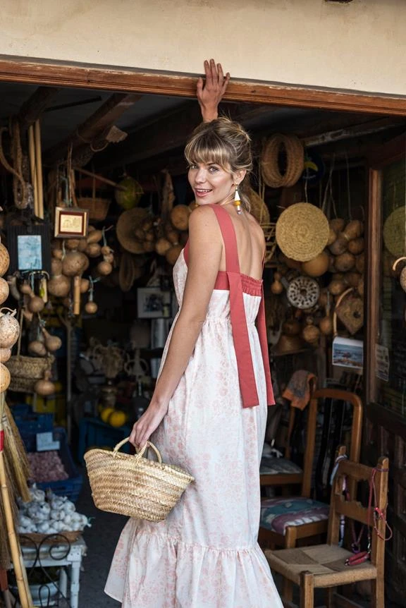 Maxi dress with contrast straps and neckline. Lined body in the organic cotton version. Gathered details in waist and skirt.