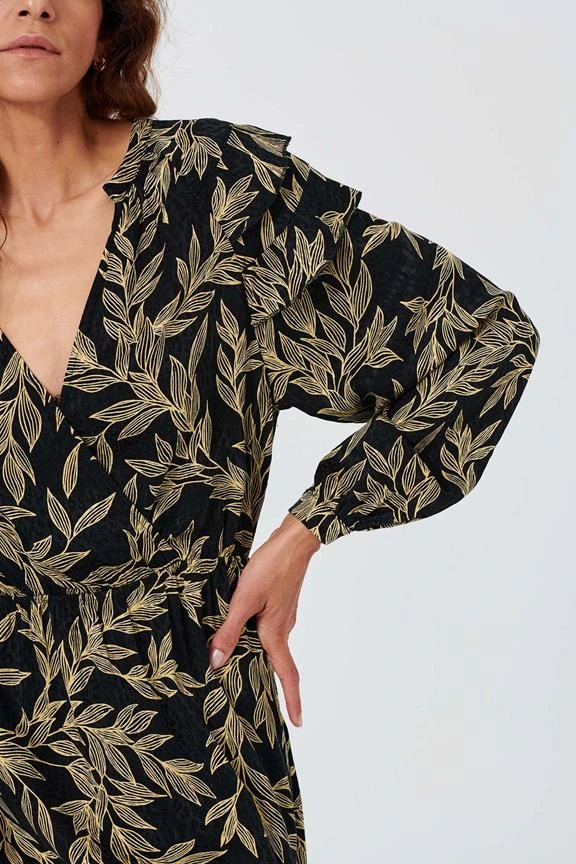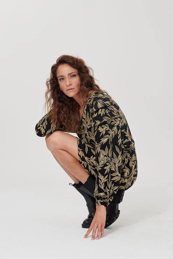 Delicate ruffles contrast with the wide raglan sleeves. The centerpiece of this model is the deep cache-cœur neckline with hook closure. FRIEDI is made of 55% cupro (Bemberg™) and 45% viscose (LENZING™ ECOVERO™). Leo jacquard meets exciting print designs.