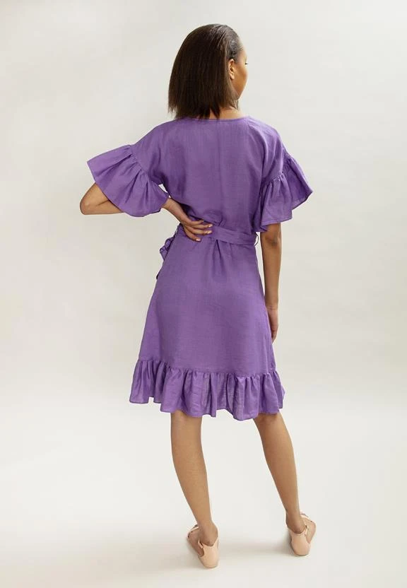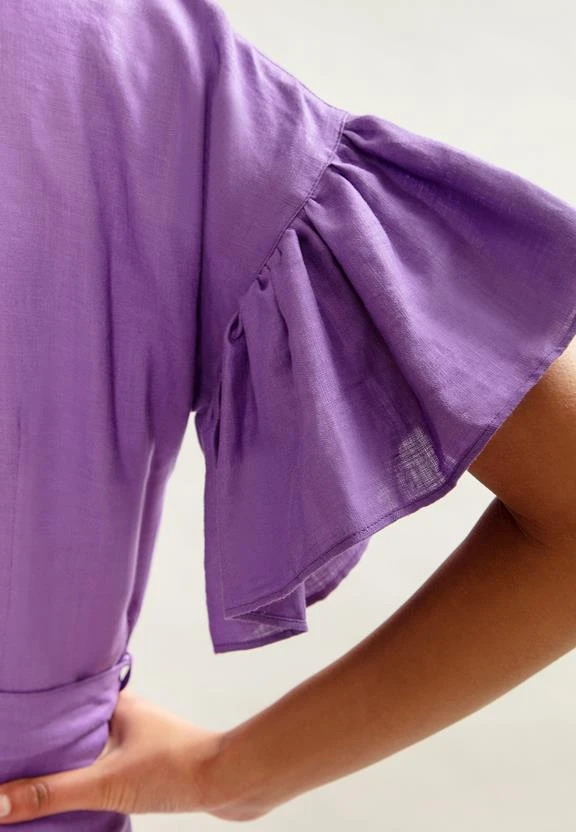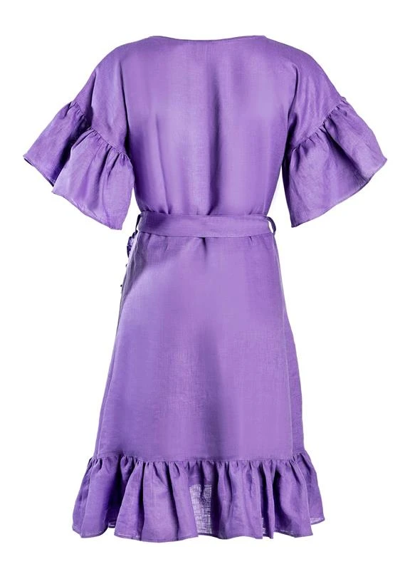 Bohemian and relaxed dress. Goes well with everyday and festive occasions. The material is beautifully draped, thin organic linen fabric. With the detachable fabric belt you can easily change the look and fit of the dress. Belt loops on both side seams. Regular fit.