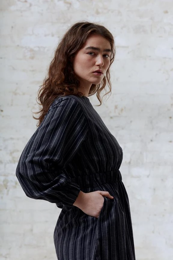 COLOR: Ikat weave: black base fabric with beige-white stripes