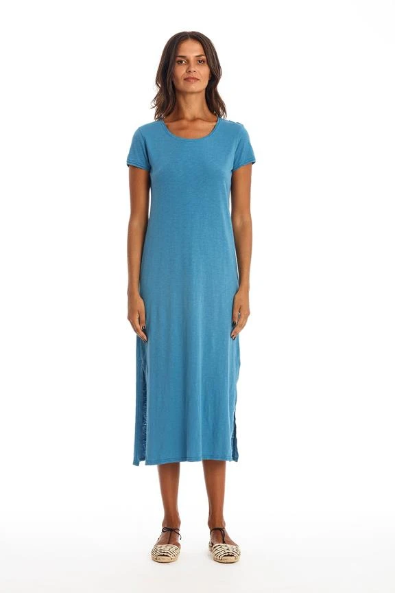 - Round neck dress with short sleeves.