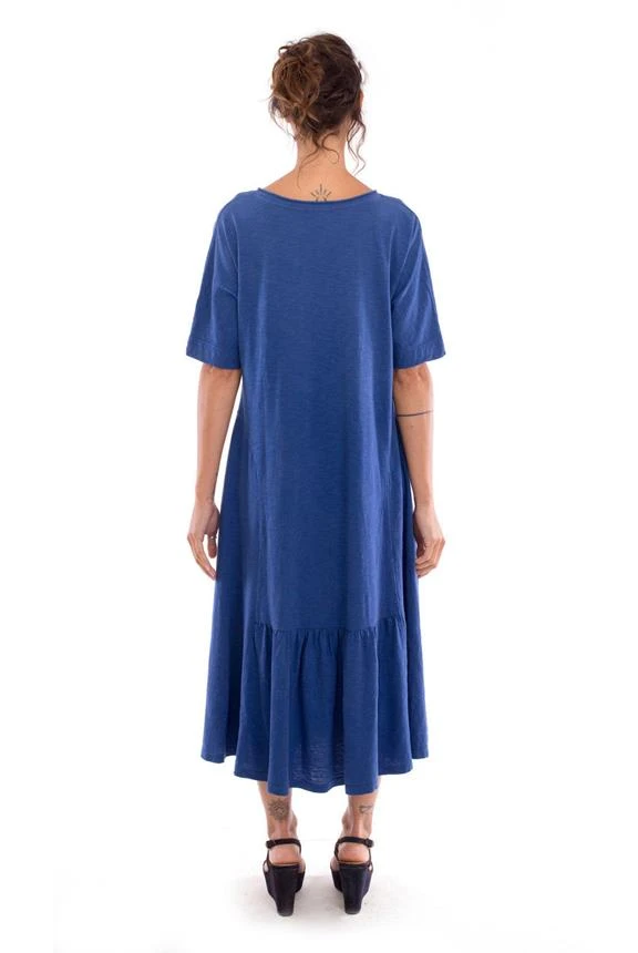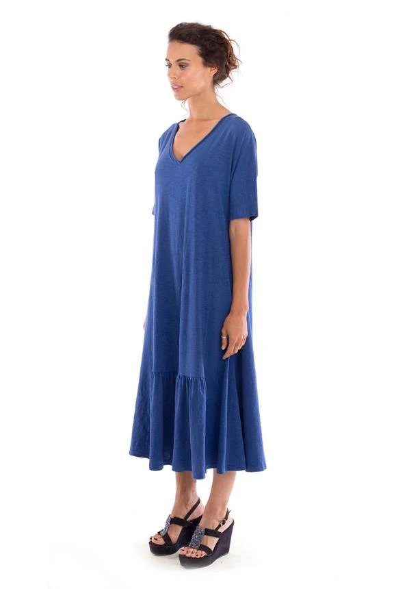 Long “loose fit” dress with frills and a V neck.
