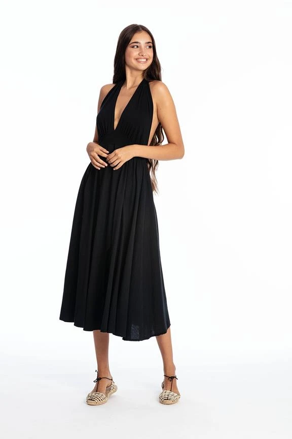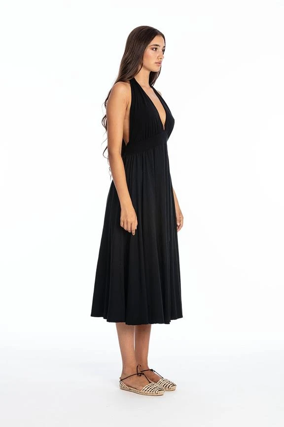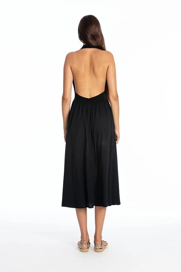 Long sleeveless dress with V neckline and an open back.