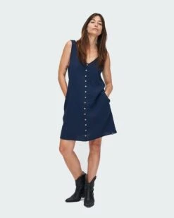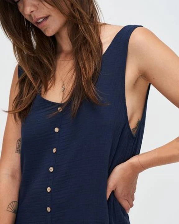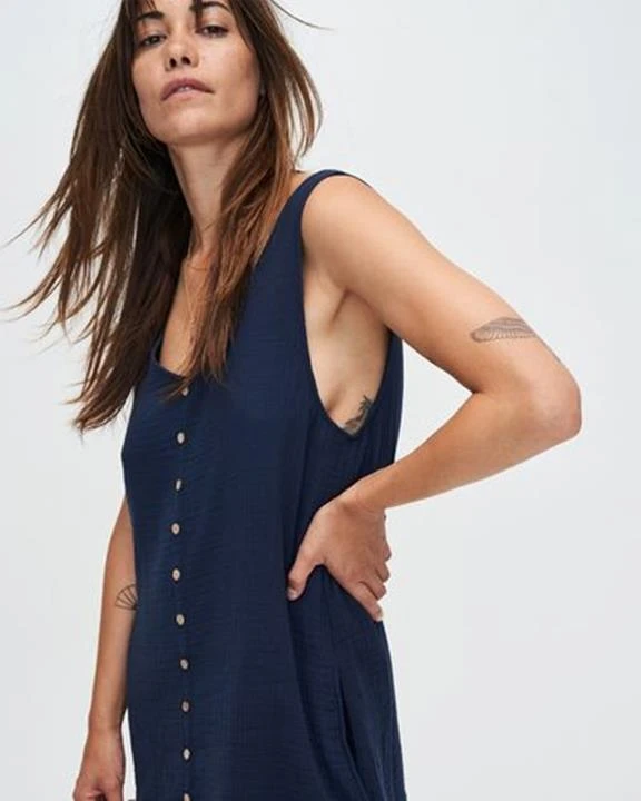 The Stella is a playful, sleeveless dress that cuts off above the knee and is made of a soft, 100% organic cotton fabric. Wear the button-down dress belted to accentuate your waist or draped for a casual silhouette. The small buttons on the top are made of coconuts. Coconut shells are generally a waste byproduct of the food industry, so turning them into buttons is a sustainable solution we love.