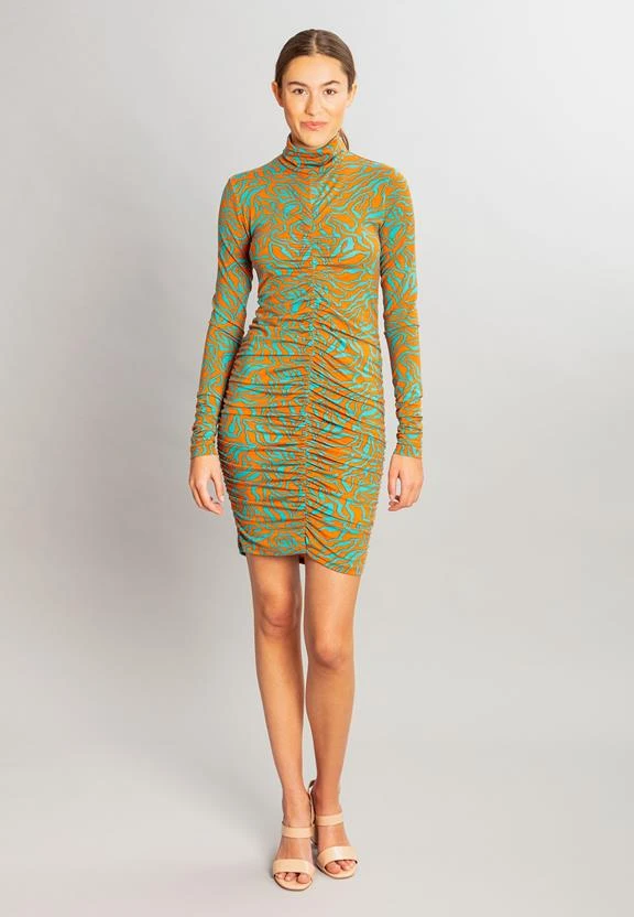 Fitted dress with turtleneck and ruffles on the sleeves. The dress is made from Tencel ™ modal, more environmentally friendly fibers made from wood pulp.