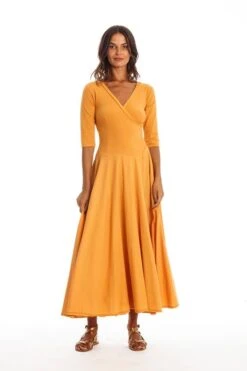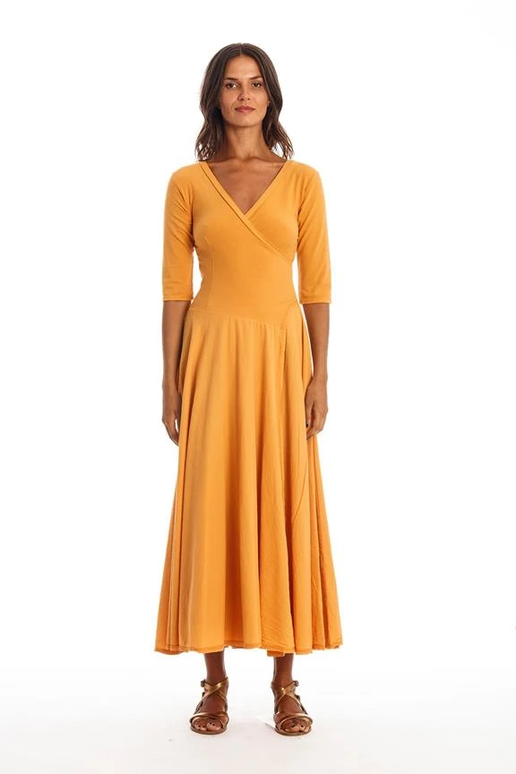 Long V neck dress with 3/4 sleeves.