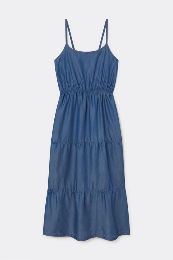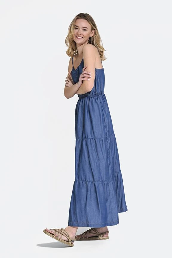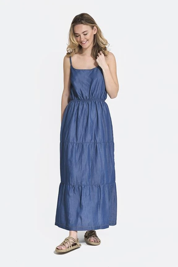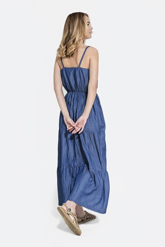 Long sleeveless dress with elastic waist and three lower pieces with gathered.