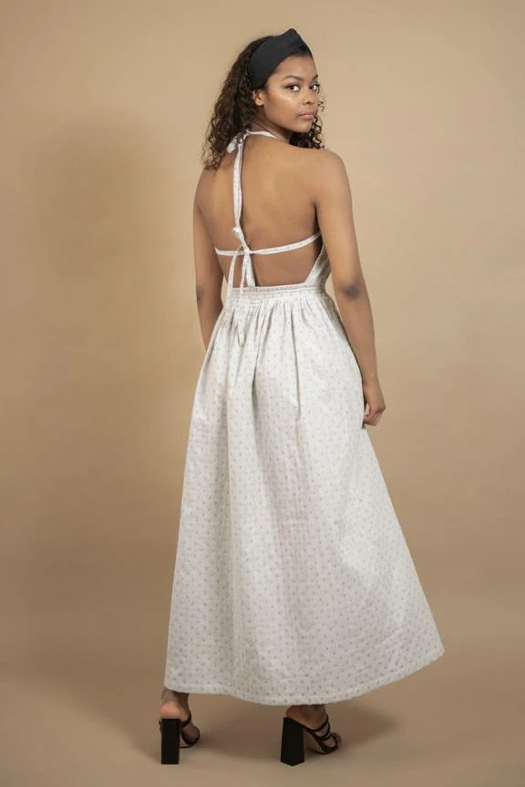 The Celestial Maxi Dress is a voluminous maxi dress with an open back. The fabric gathers on the waist and the neck and goes down to a full flowy hem. Organic elastic band on the waist with smocking stitches over it. Tie straps on the neck and back that fall elegantly on the open back. Made from a super soft organic cotton fabric with a beautiful moon and star print.
