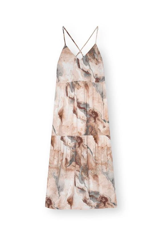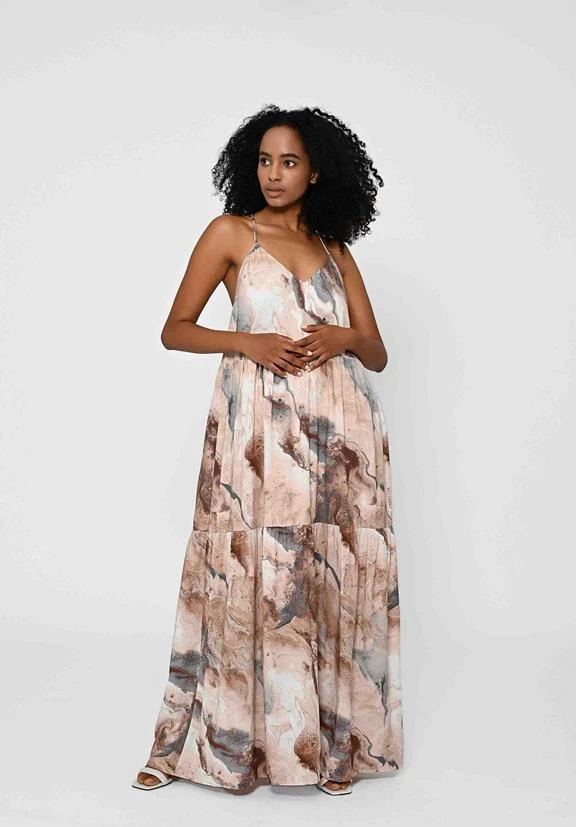 A gorgeous maxi length summer dress. With ruffles, V-neck and crossback detail. Made of soft LENZINGâ„¢ ECOVEROâ„¢. Printed with exciting motifs. Love at first sight!