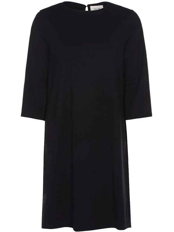 Generously sized, versatile shift dress that lands at the knee or just below. It has 3/4 length sleeves with no shoulder pads. There are two discreet invisible pockets for comfort and ease of wear. There’s a simple one button closure at the back