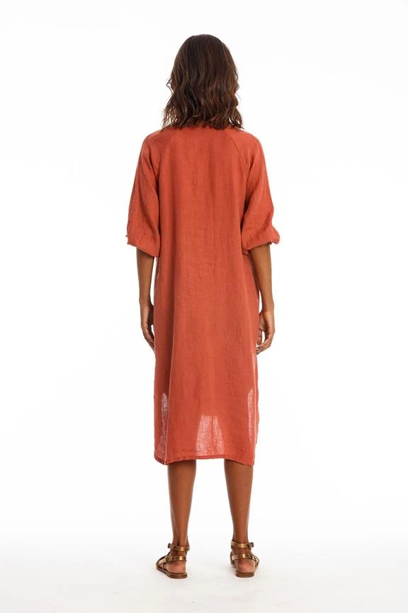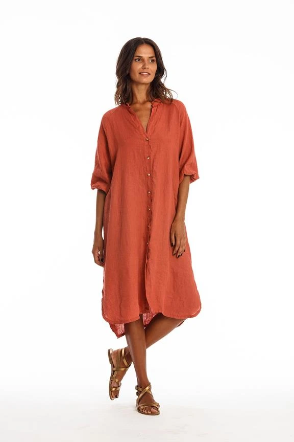 - Mao neck, buttoned linen shirt dress with puffed sleeves.