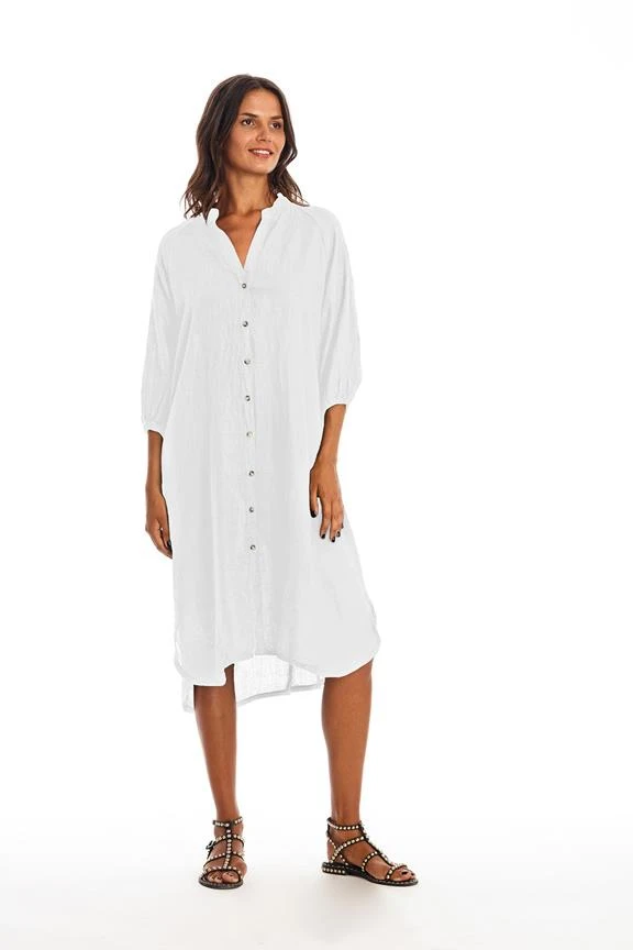 - Mao neck, buttoned linen shirt dress with puffed sleeves.
