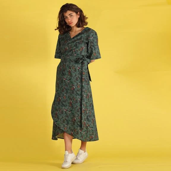 Long wrap dress “Lilla” made from certified organic cotton (kbA) with a beautiful pattern (birds, leaves, flowers). The dress has kimono sleeves that are rolled up at the end. The skirt has a round shape and falls particularly beautifully.